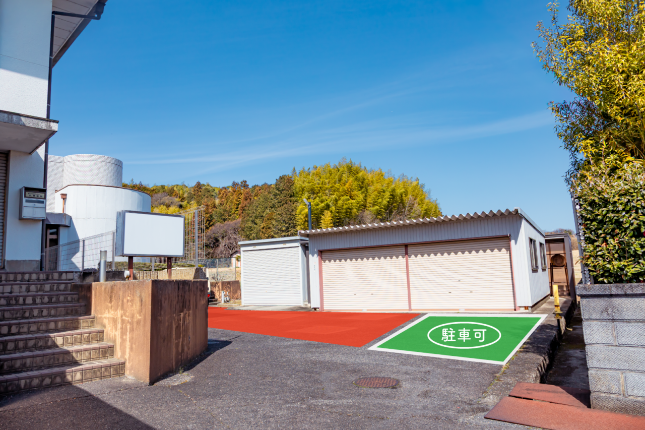 発熱外来診察中は正面駐車場の他に、発熱外来専用入口側のスペースにも1台駐車して頂けます(写真の緑色のスペース)。